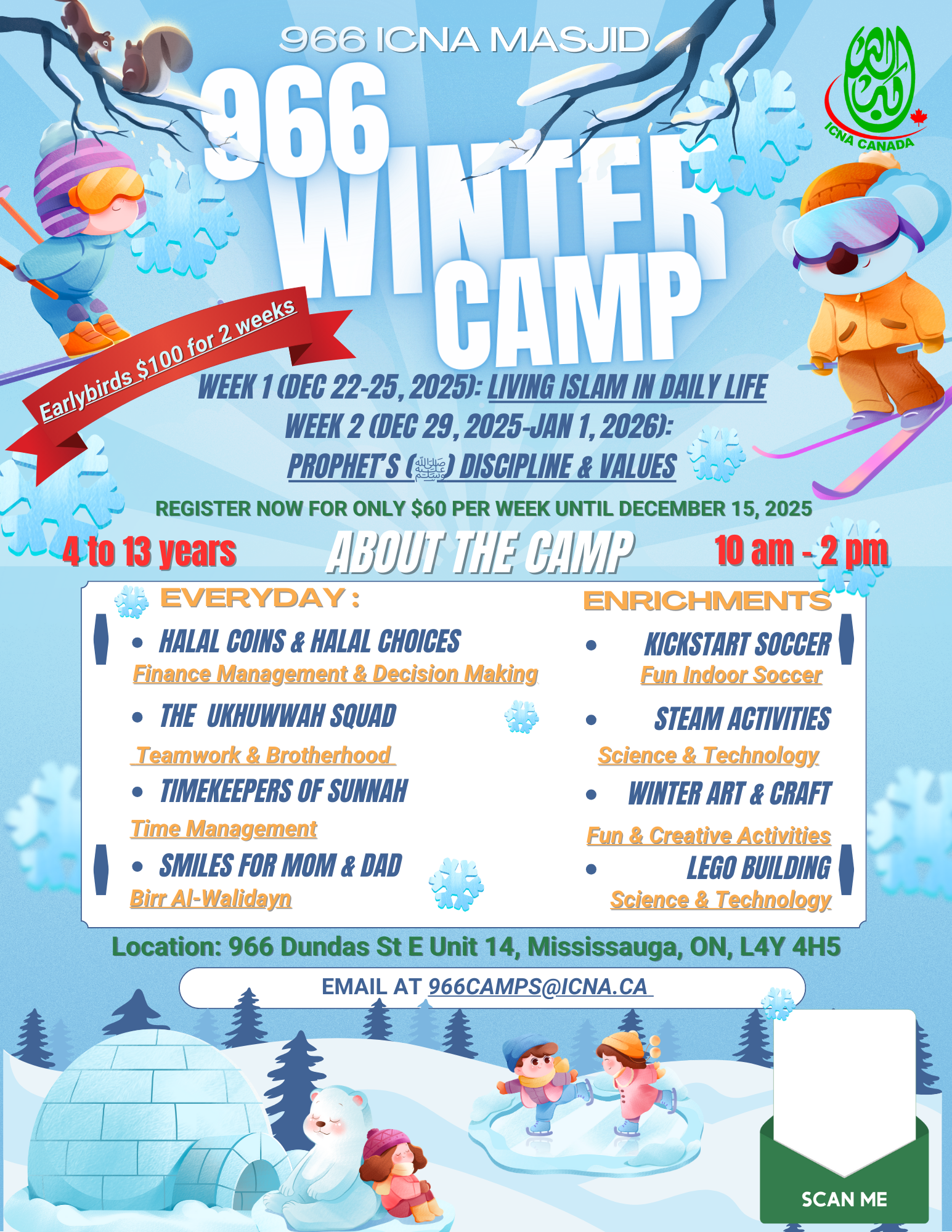 As the school break approaches, we are excited to announce that registration is now open for the 966 ICNA Masjid & Youth Centre WINTER CAMP 2025—a unique program designed to combine Islamic learning, character building, and fun-filled winter activities!